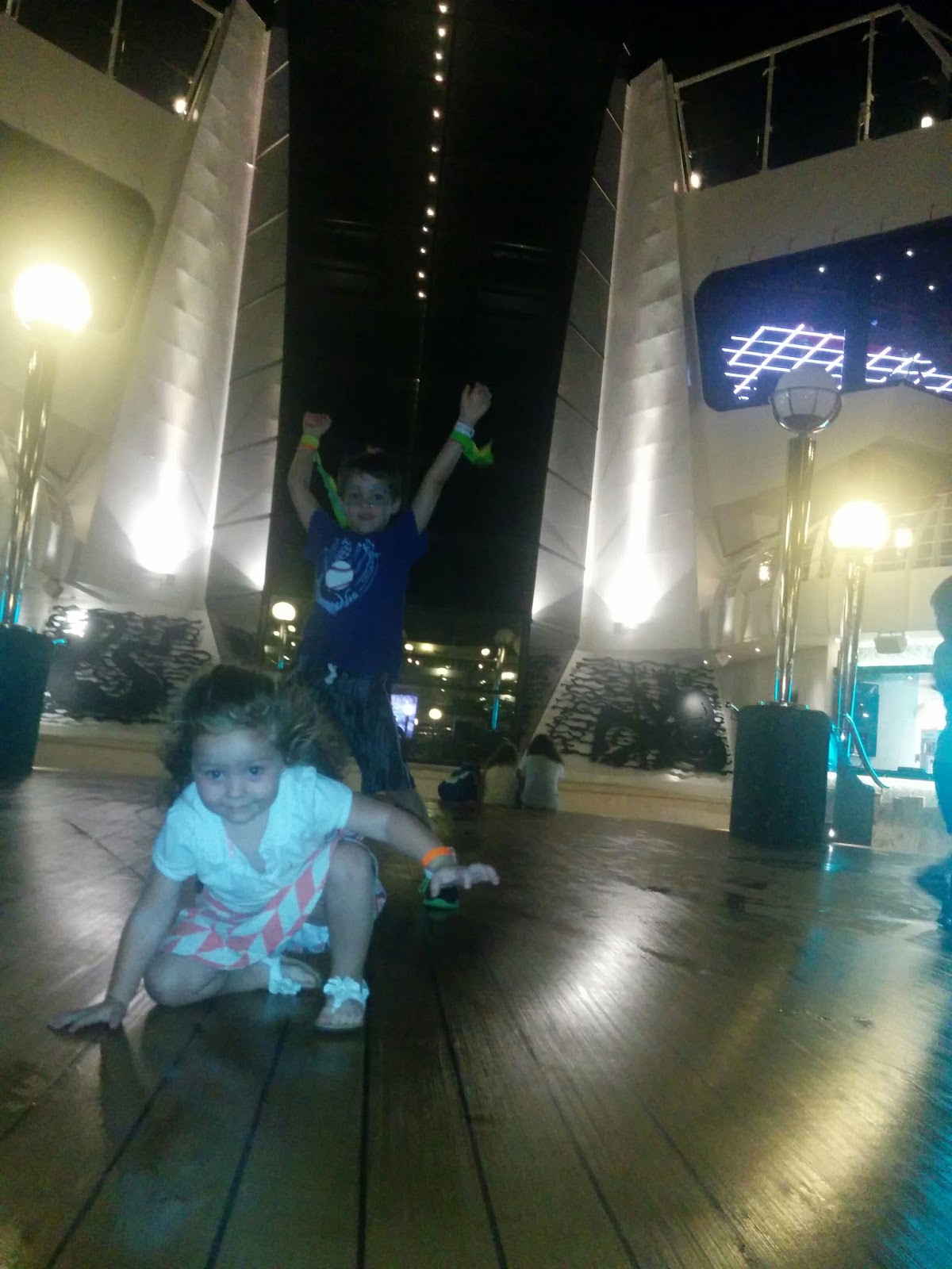 After our last dinner, we went to get the boys from Kids Club, they couldn't wait to show us their decorations from the kids parade. It turned into a dancing party on the top of the ship.